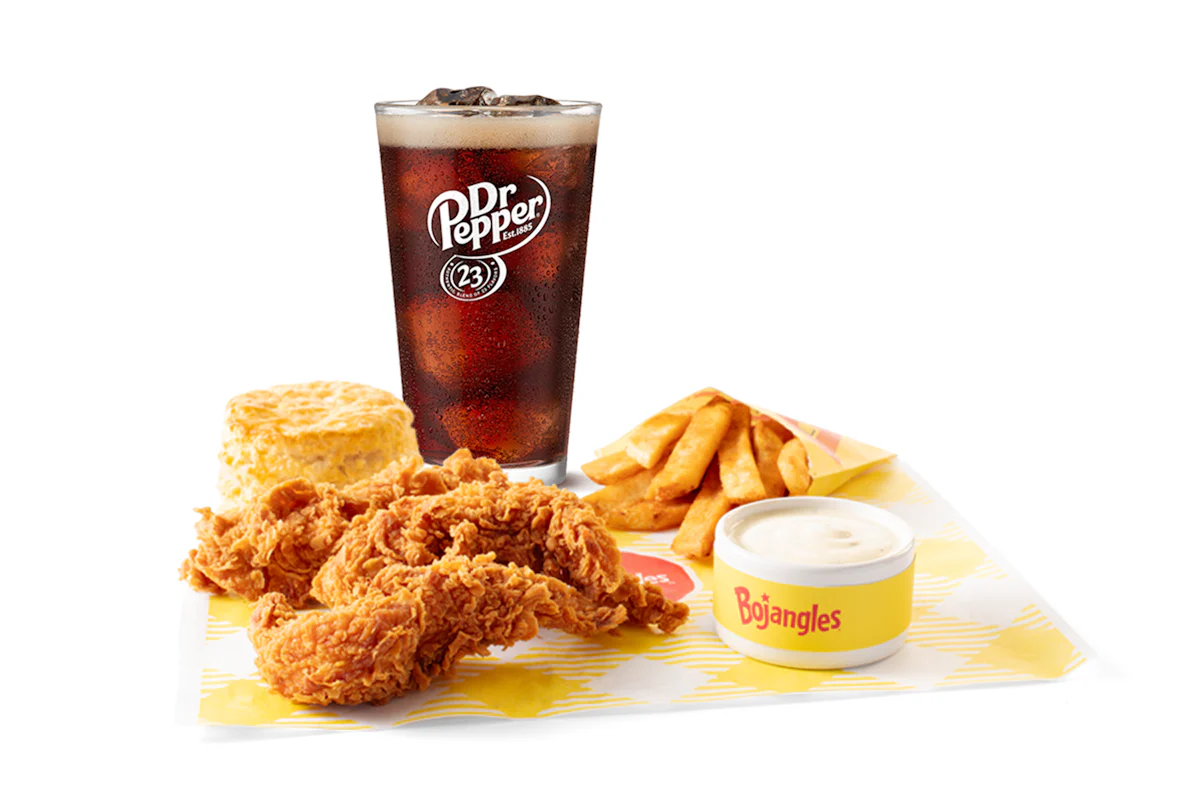 3 chicken breast tenderloins marinated with a bold blend of seasonings and served with a made-from-scratch biscuit, a fixin’, and a Dr Pepper.